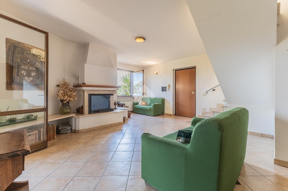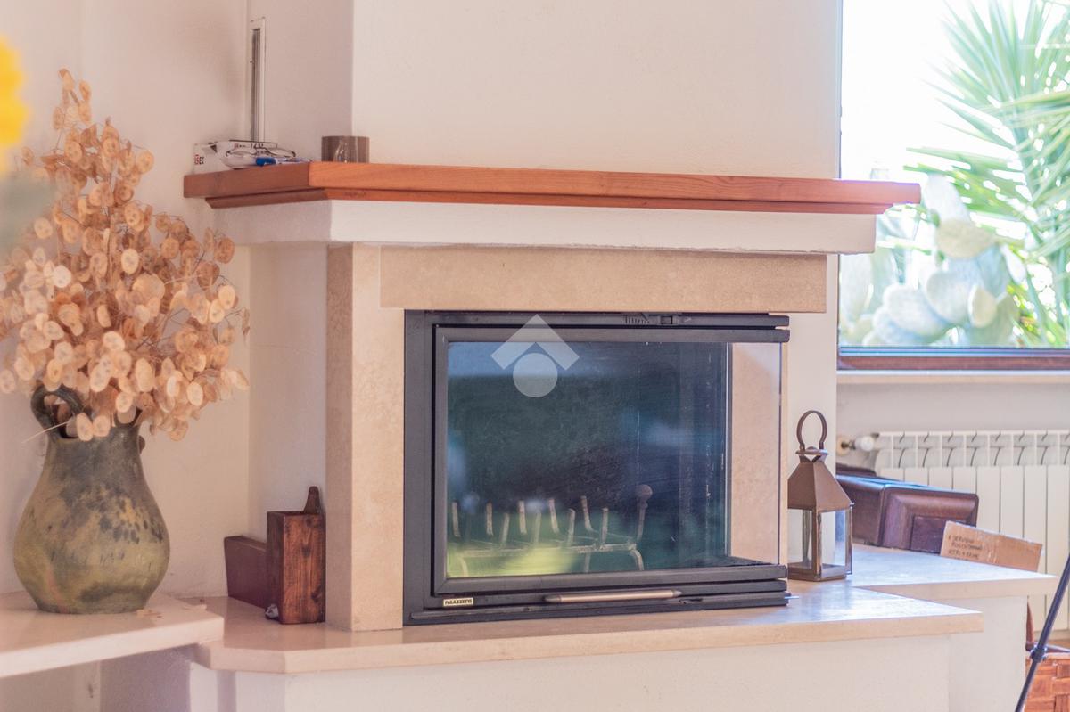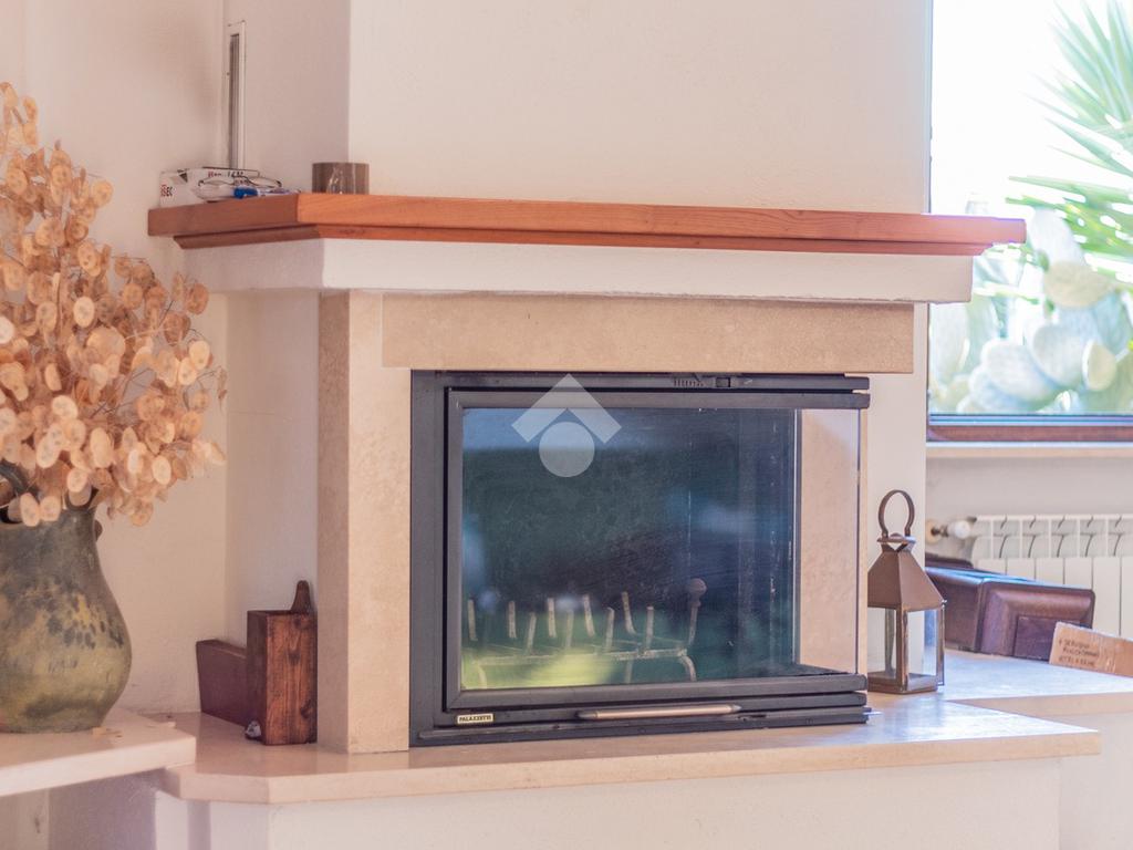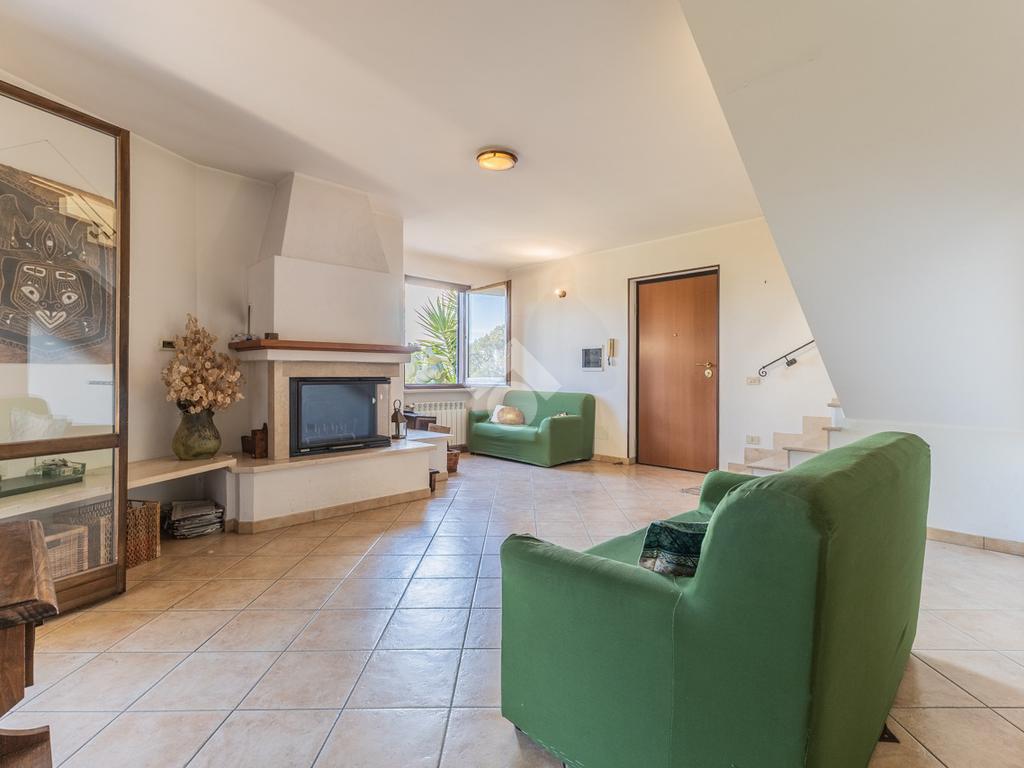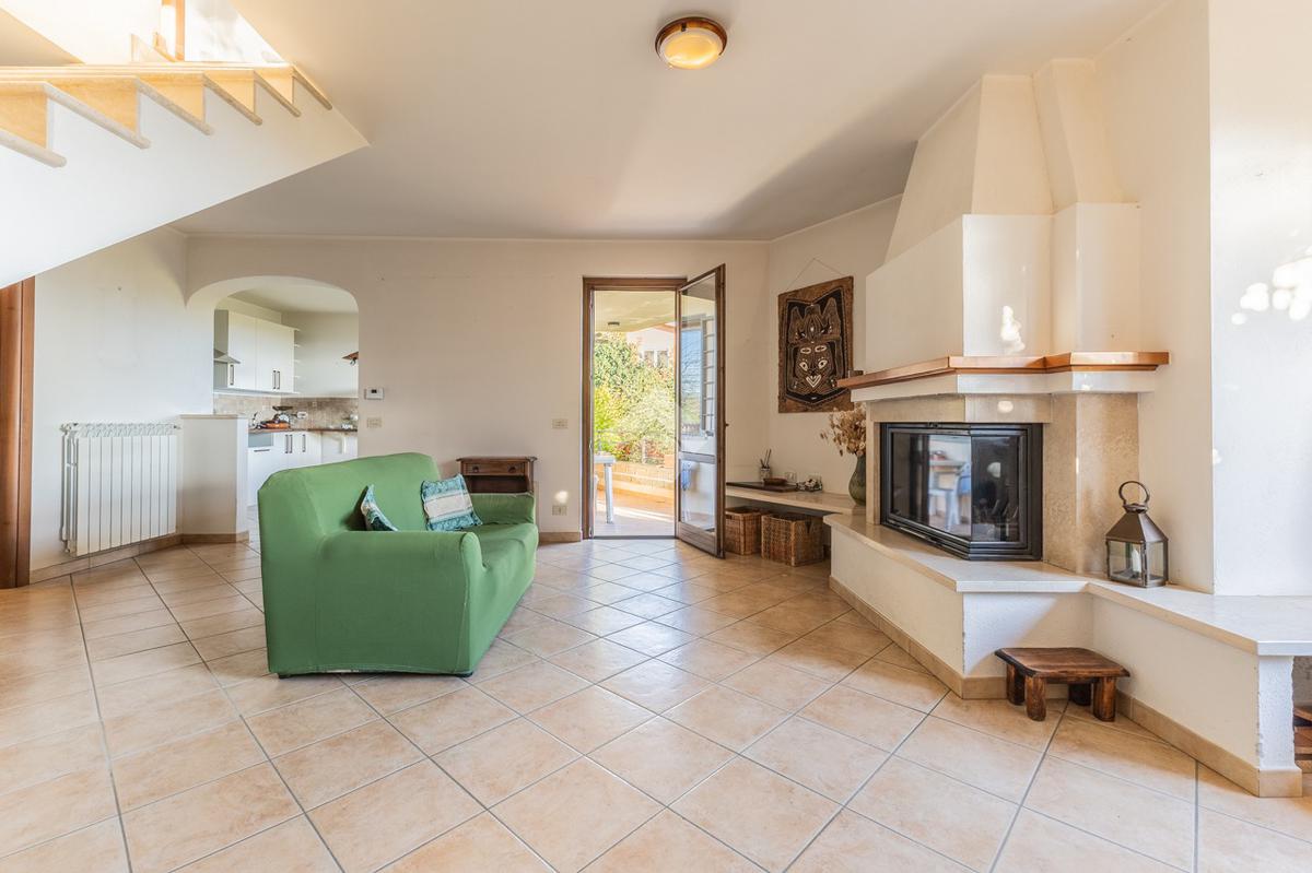 Una scala esterna conduce all’ingresso dell’abitazione, dove si apre la zona giorno composta da un ampio e luminoso soggiorno con termo camino e porta finestra che dà accesso al terrazzo, ideale per momenti di relax all’aperto.