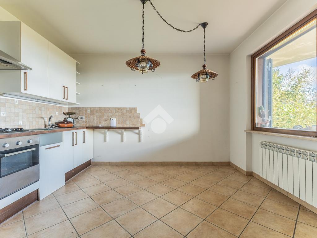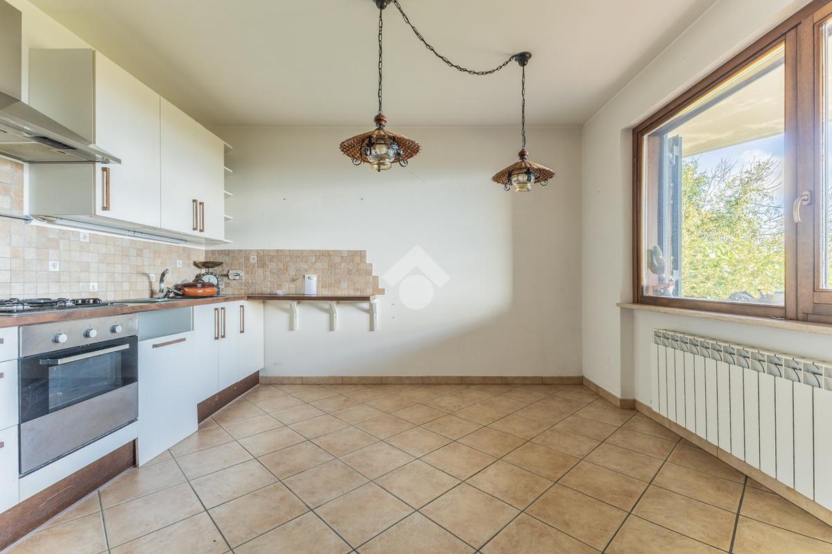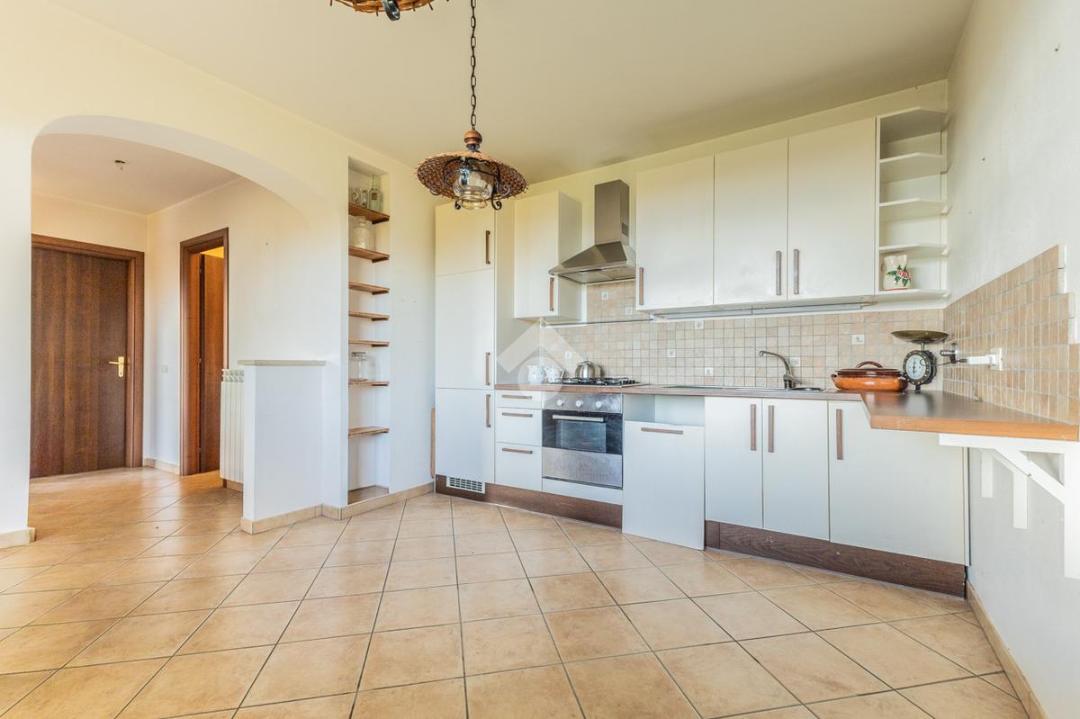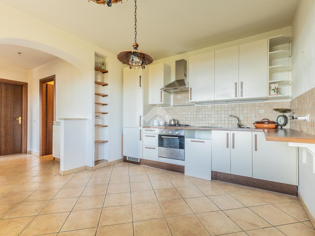 Il soggiorno è separato dalla cucina abitabile da un elegante arco, e, quest’ultima, gode di una grande finestra che offre una splendida vista panoramica.