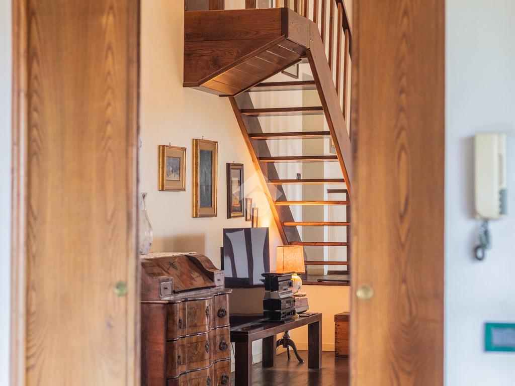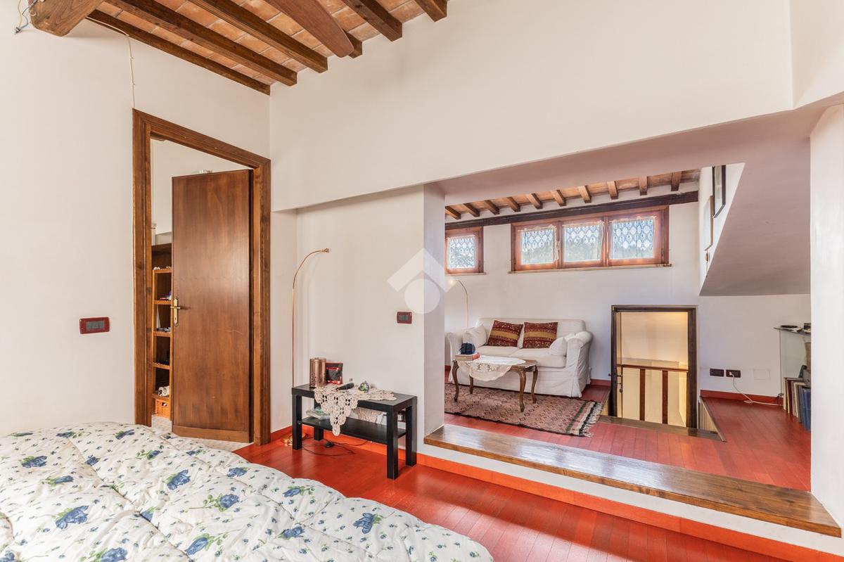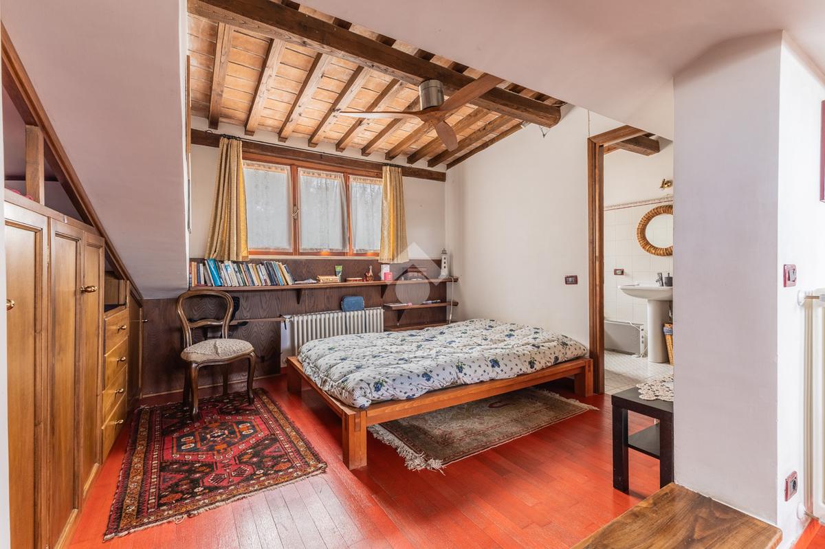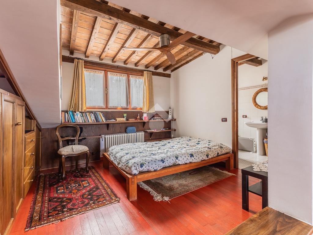 Dalla zona giorno, tramite una scala in legno, si accede alla camera mansardata, una vera e propria suite di grande fascino.