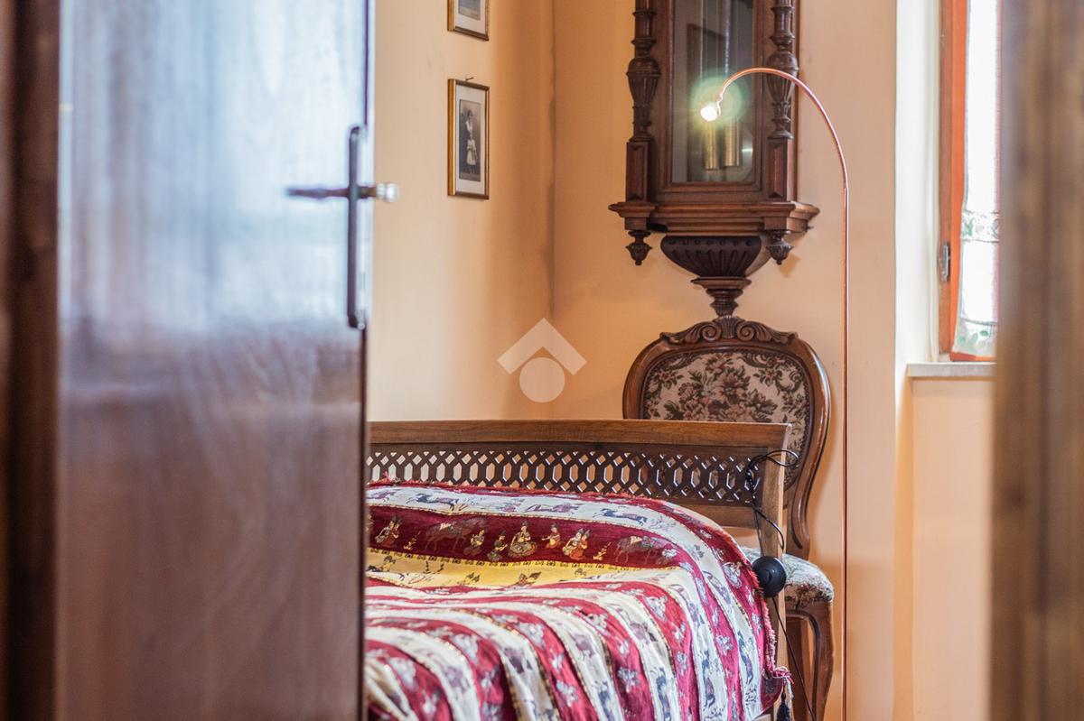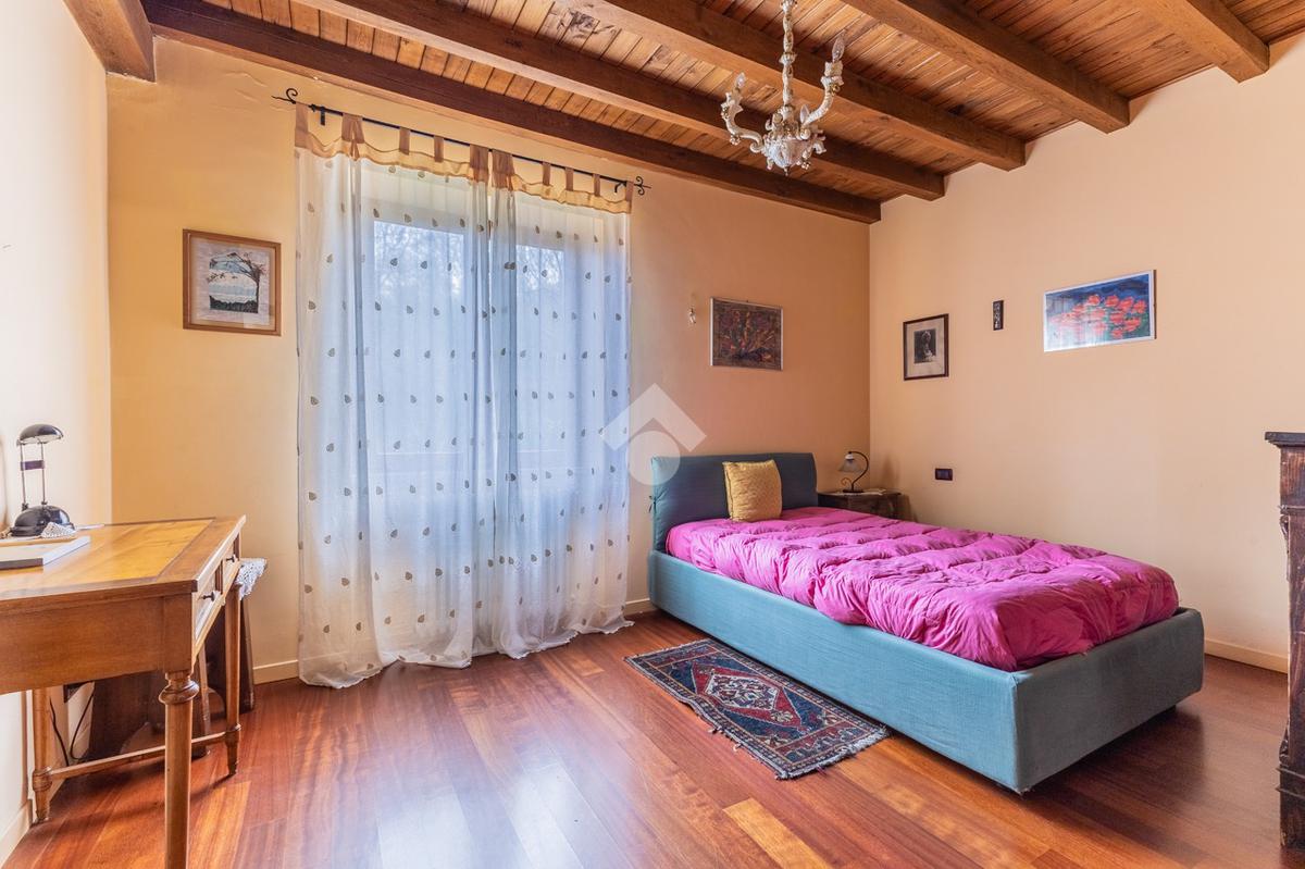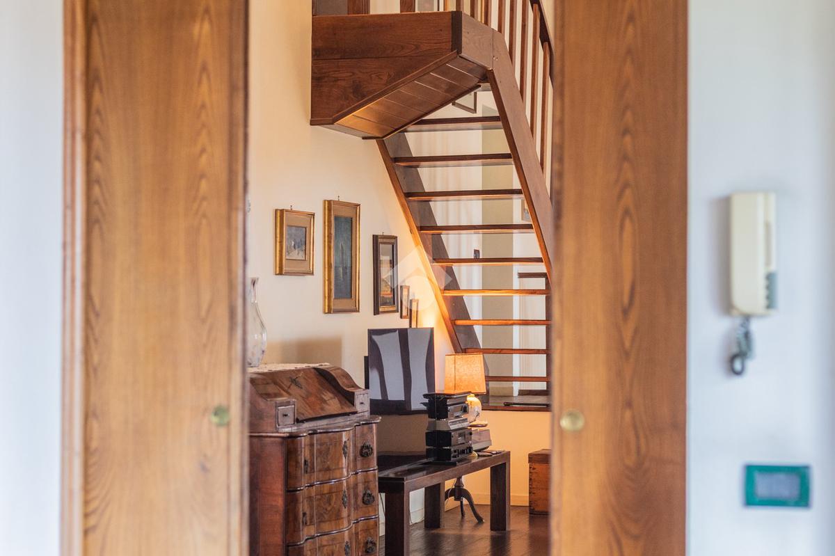 Dalla zona giorno, tramite una scala in legno, si accede alla camera mansardata, una vera e propria suite di grande fascino.