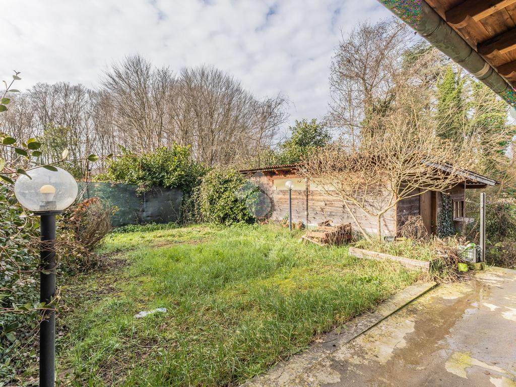 Al piano terra l’ingresso conduce ad un luminoso soggiorno con angolo cottura, valorizzato da una doppia vetrata affacciata sul giardino, che dona luce naturale e un’atmosfera accogliente all’ambiente. Dalla zona giorno è inoltre presente un’uscita sullo spazio esterno posteriore, in parte coperto da una tettoia in legno e in parte adibito a giardino. Completa il piano un comodo bagno di servizio.